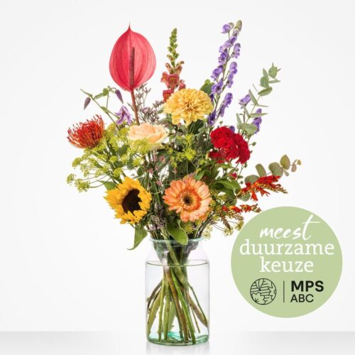 Het Groen Gekeurd pluk boeket is een uniek boeket, samengesteld door Bloemenfeest. Het boeket bestaat uit duurzaam gekwalificeerde MPS-A+ of MPS-A kwaliteitsbloemen die op het moment van bestellen goed beschikbaar zijn. MPS- ABC is het wereldwijde certificaat dat duurzaamheid van bloemen aantoonbaar maakt. Door te kiezen voor een ‘Groen Gekeurd’-boeket ben je zeker van de meest duurzame en groene keuze uit het Fleurop assortiment. Het afgebeelde boeket is een voorbeel, excl. vaas.